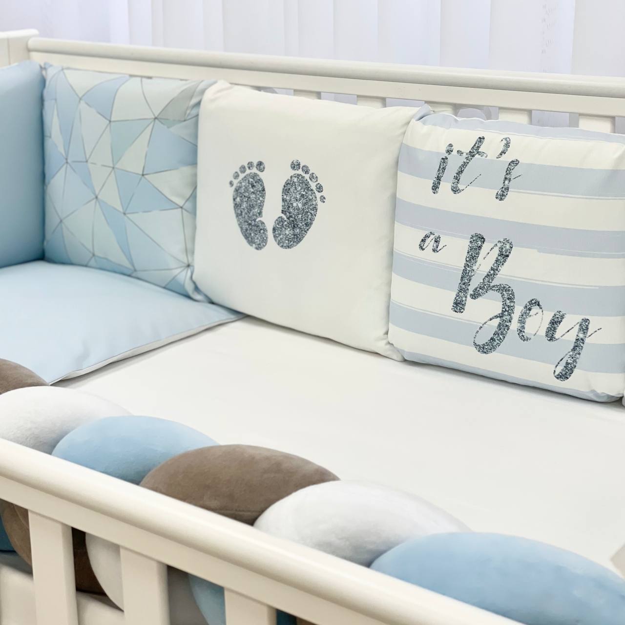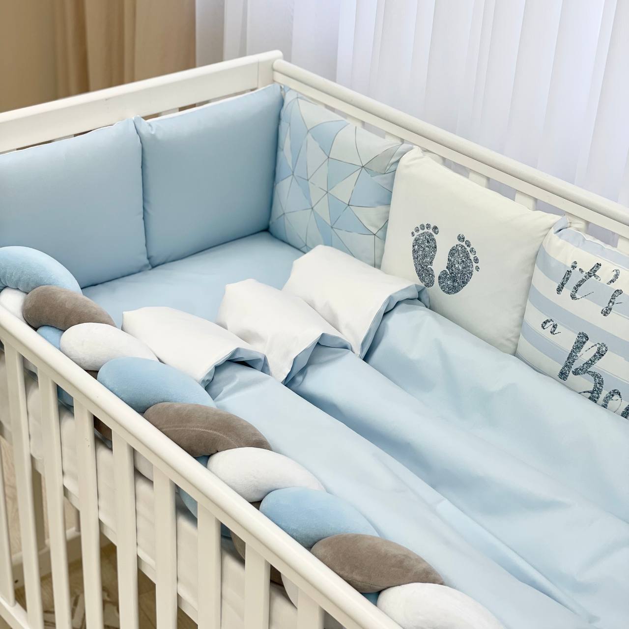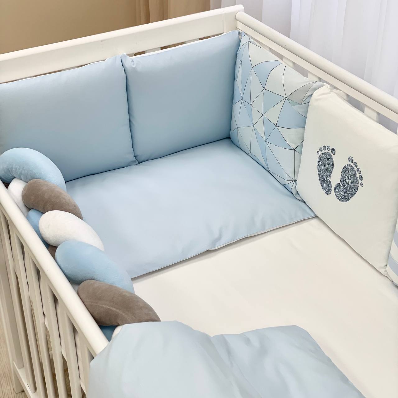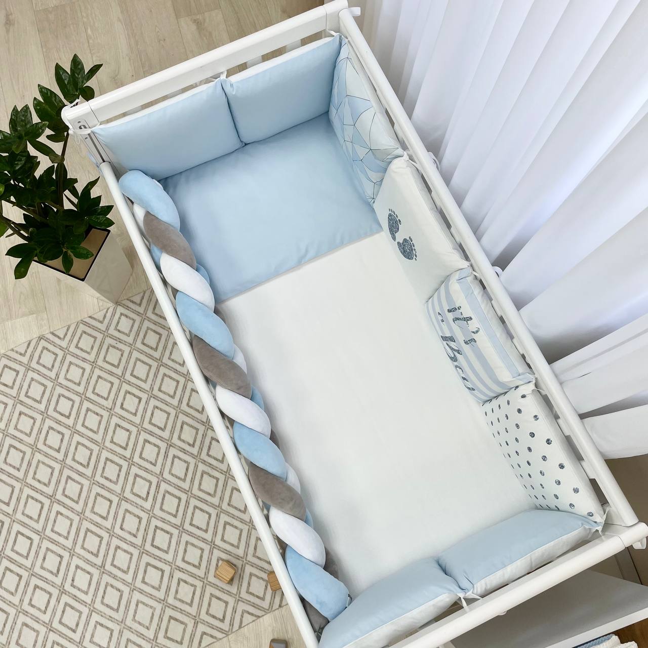 Velikost: zaščitne stranske blazine (30×32 cm vsaka), obroba kitka 120×17 cm, odeja 90×110 cm, vzglavnik 40×60 cm, rjuha z elastiko 120×60 cm.