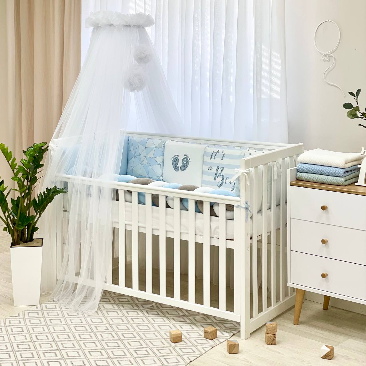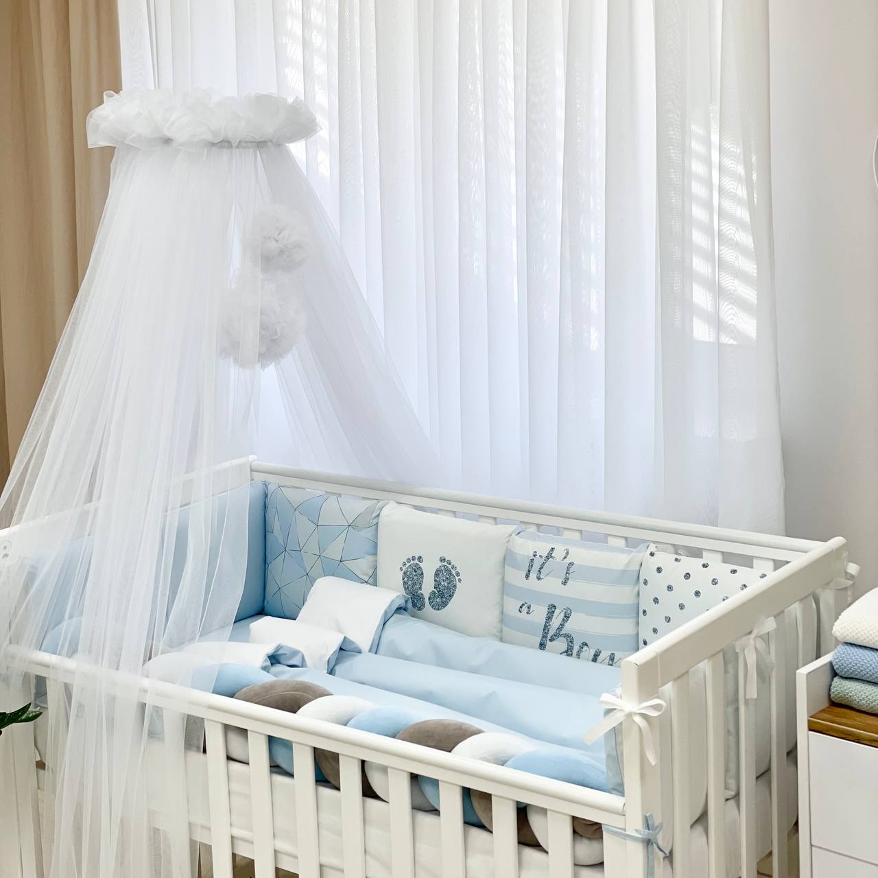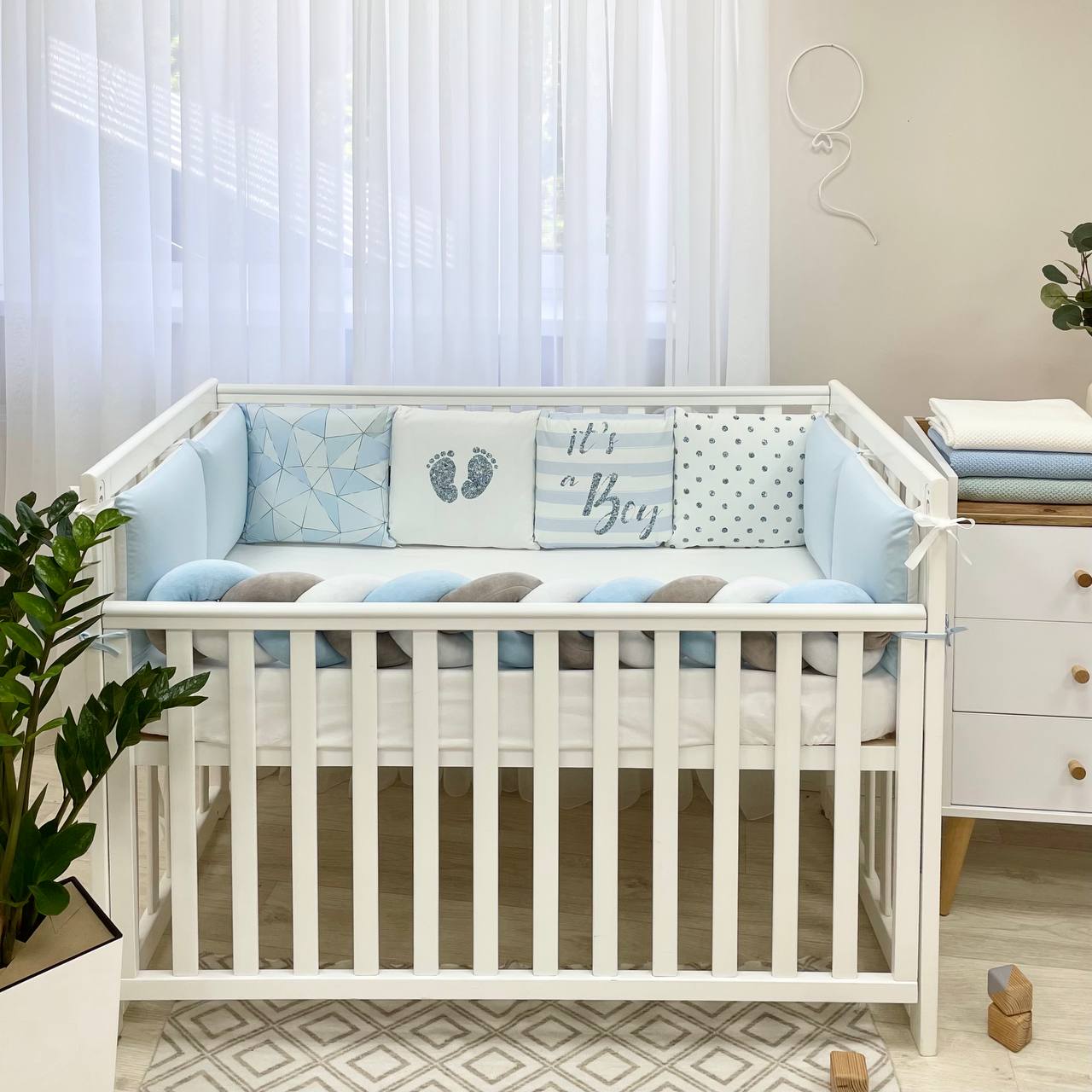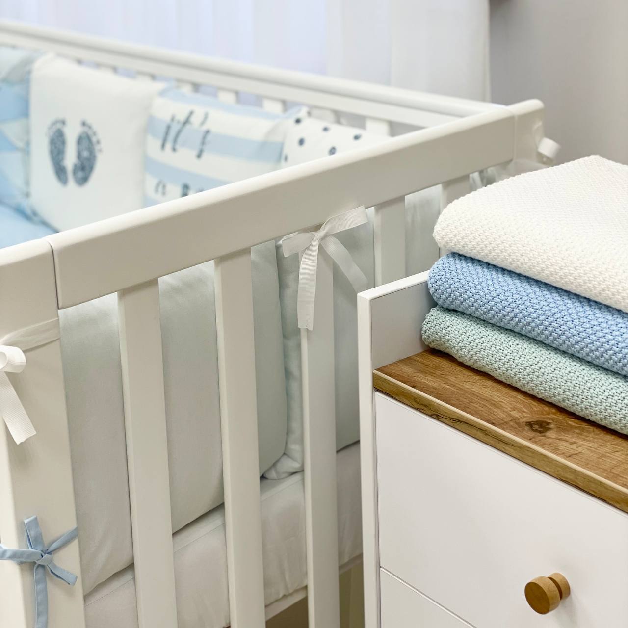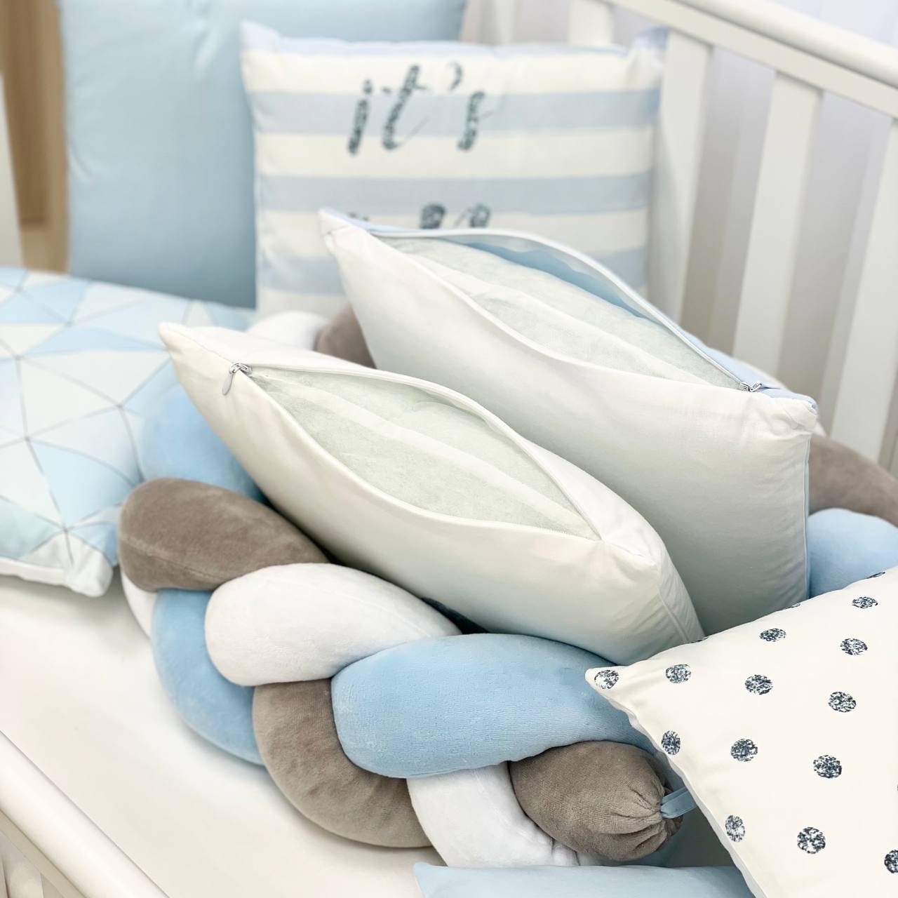 Velikost: zaščitne stranske blazine (30×32 cm vsaka), obroba kitka 120×17 cm, odeja 90×110 cm, vzglavnik 40×60 cm, rjuha z elastiko 120×60 cm.