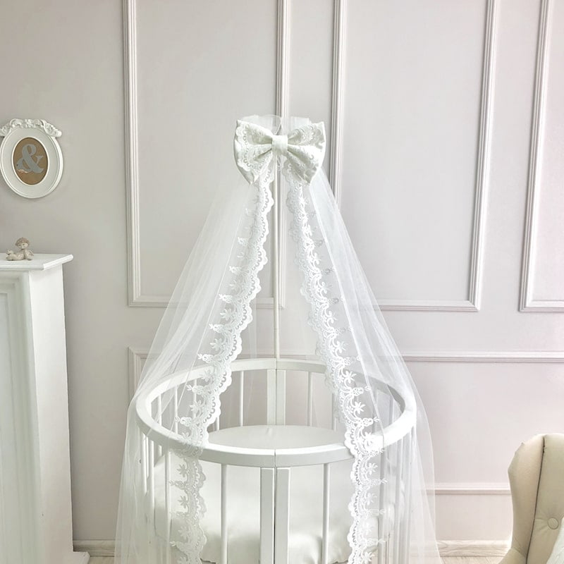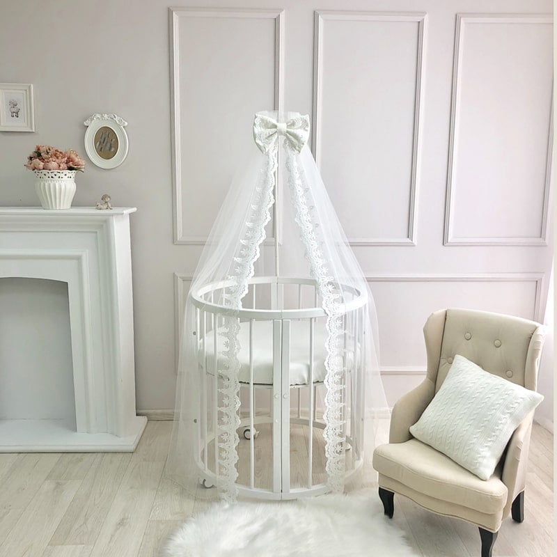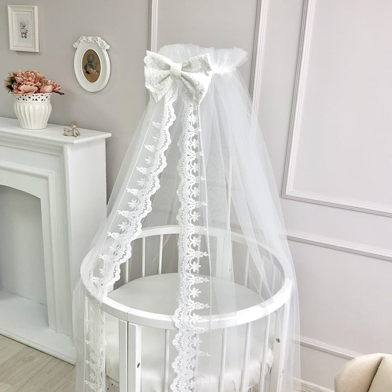 Tehnologijo pletenja so razvili strokovnjaki na področju otroškega blaga. Zahvaljujoč temu pristopu baldahin popolnoma prepušča zrak, hkrati ščiti otrokov spanec pred mrčesom in vetrom. Zadostna preglednost vam omogoča opazovanje otroka. Zahvaljujoč lahki tkanini se ustvari posebno nežno vzdušje otroške sobe.