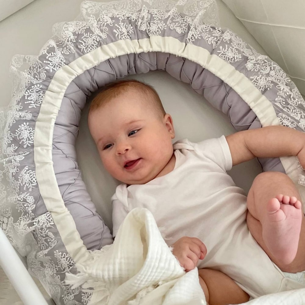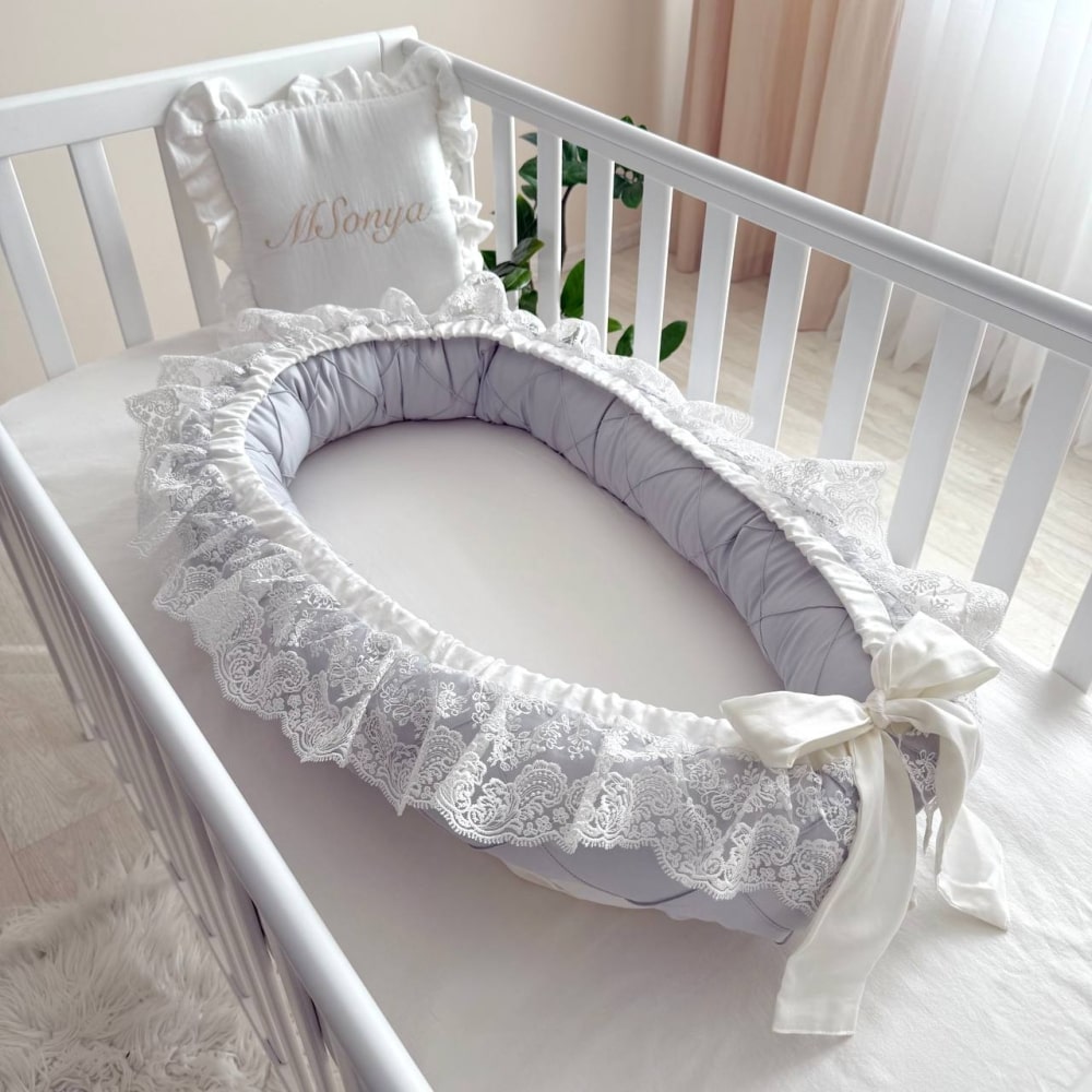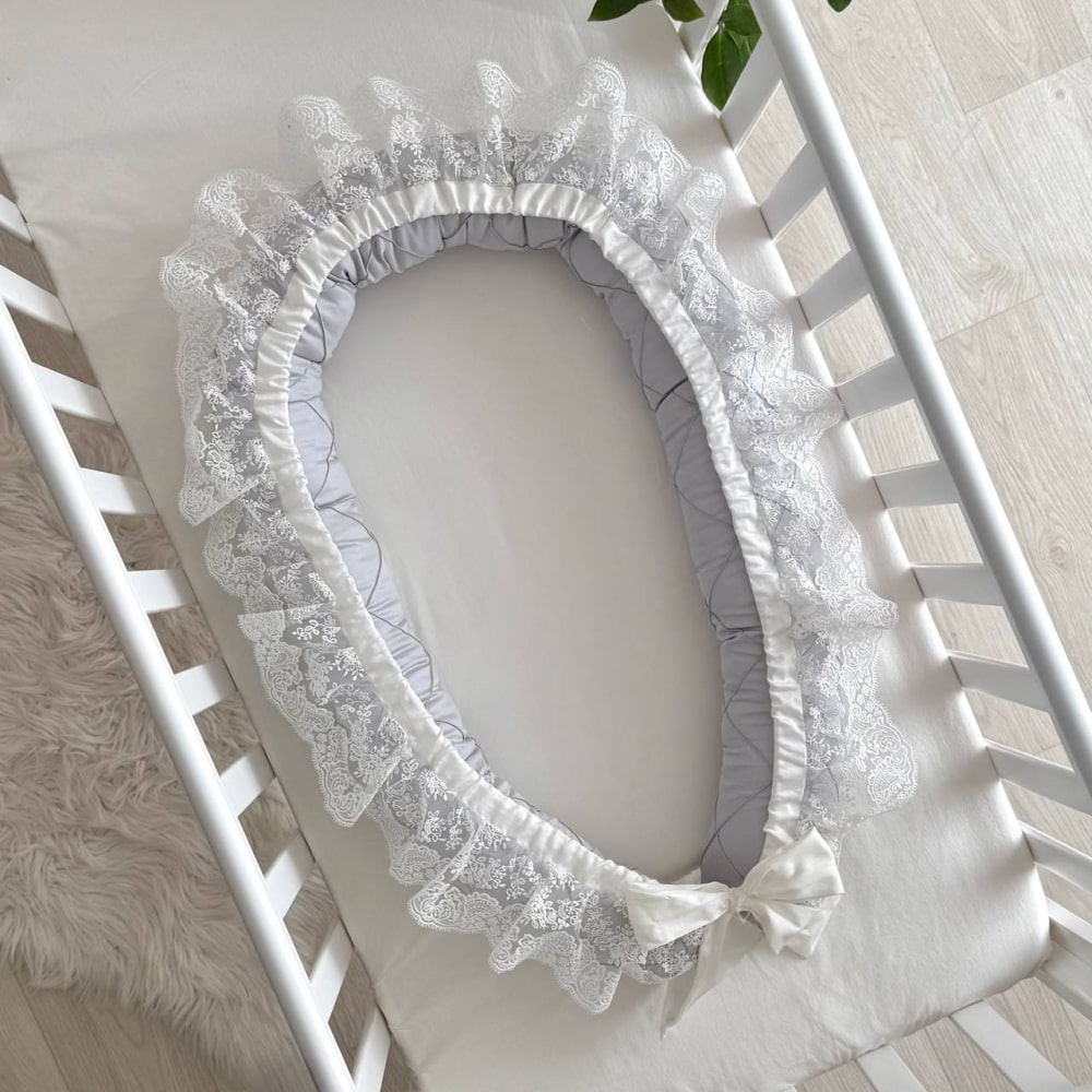 Kraljevsko gnezdece v sivi barvi z izvrstno čipko.