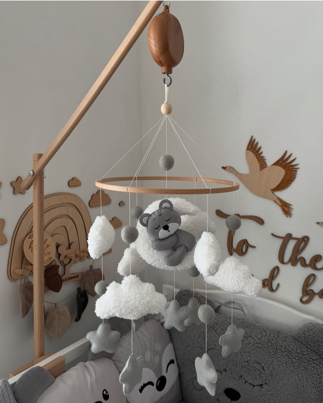 Vrtiljak za posteljico “Medvedek na lunici” siv